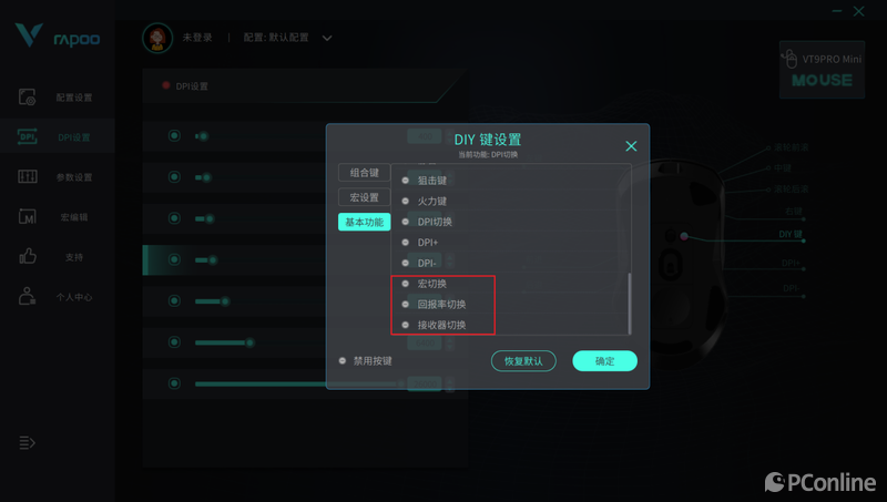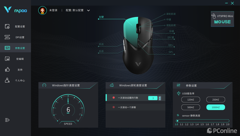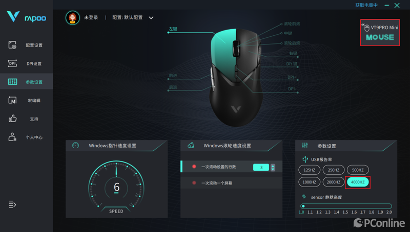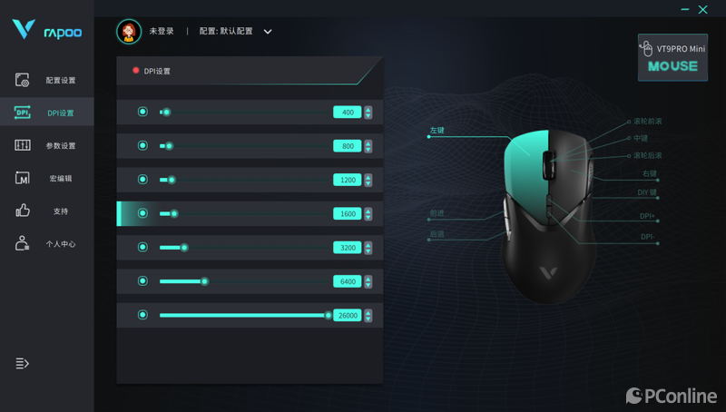 首先是DPI设置界面,除了可以用鼠标顶部的DPI切换按键或默认状态的DIY键切换,你也可以在驱动中自己设置,驱动内默认7档可选DPI,如果你想自定义也是可以的,雷柏VT9PRO mini支持50-26000的DPI设置,步进可以低至50一档。不过小编喜欢设置在3200 DPI,既能够保证日常工作的流畅,又能兼顾电竞游戏的体验。