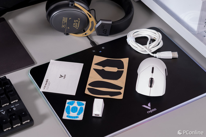 内包装采用镂空设计,更便于提起鼠标配件。当然啦,配件还是一如既往的丰富,说明书、备用脚垫、伞绳数据线、USB转接器一应俱全。