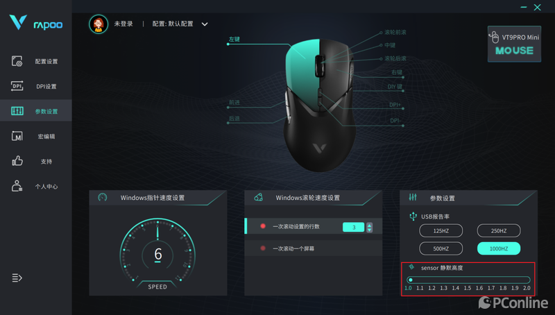 因为是定制款,它还可以实现11档静默高度调整,驱动中可以从1.0mm-2.0mm随意切换。有的玩家可能不懂这有什么用,说人话就是,有了这个它能保证大幅度移动鼠标时不会光标丢帧,也能保证抬高返回时光标不会漂移。