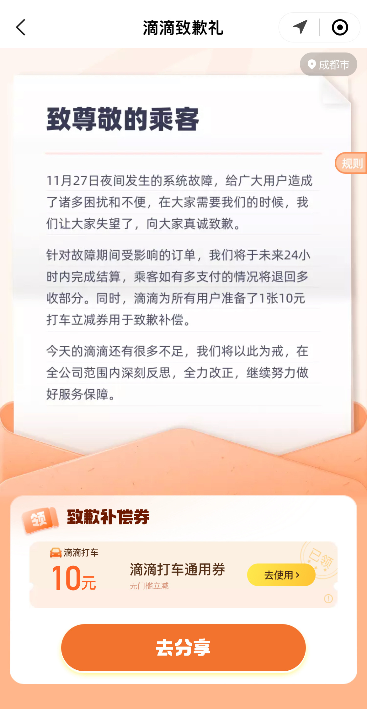 滴滴补偿所有用户10元优惠券。