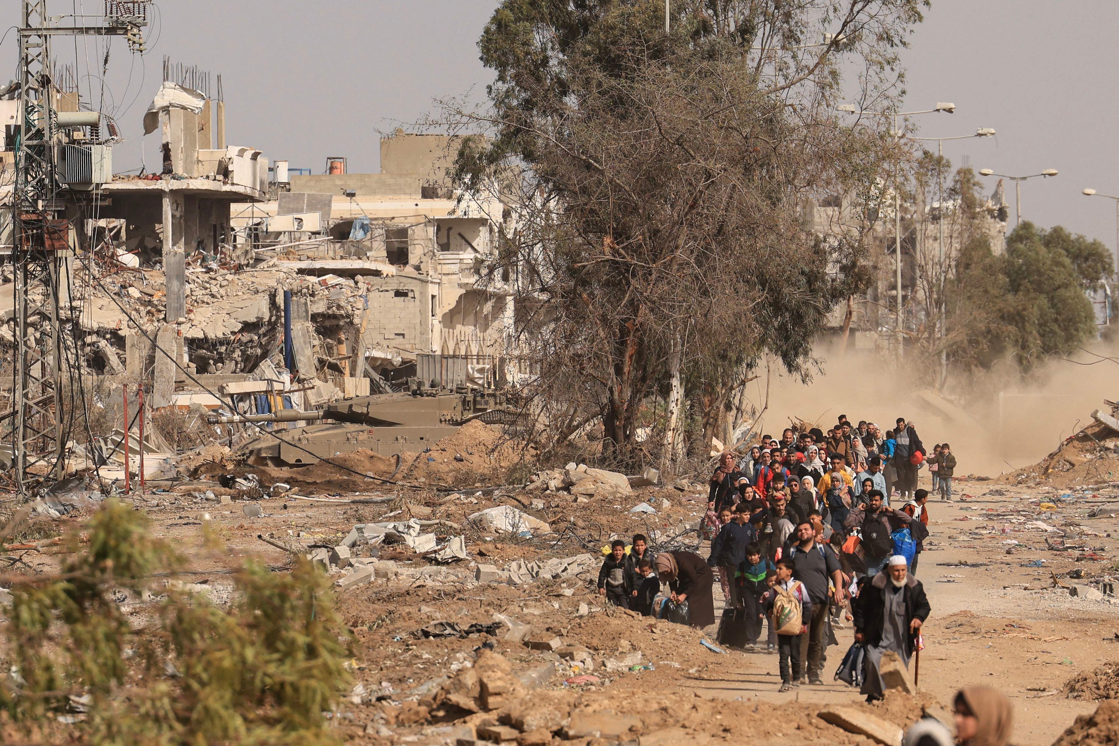11月26日,逃难的巴勒斯坦民众走在加沙城郊外的萨拉赫丁路上。