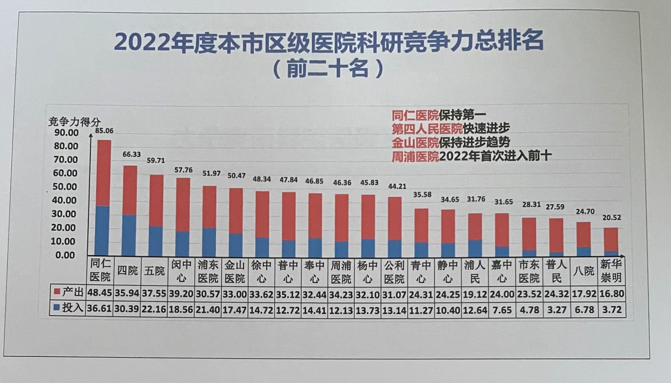 区级医院科研竞争力同期揭晓,30家医院参评,同仁医院拔得头筹,四院、五院、闵中心、浦东医院紧随其后。项目组表示,同仁医院分数遥遥领先,属多年深耕的结果,也从侧面说明科研耕耘非朝夕之功。与此同时,第四人民医院快速进步,金山医院保持进步趋势,周浦医院本年度首次进入前十。