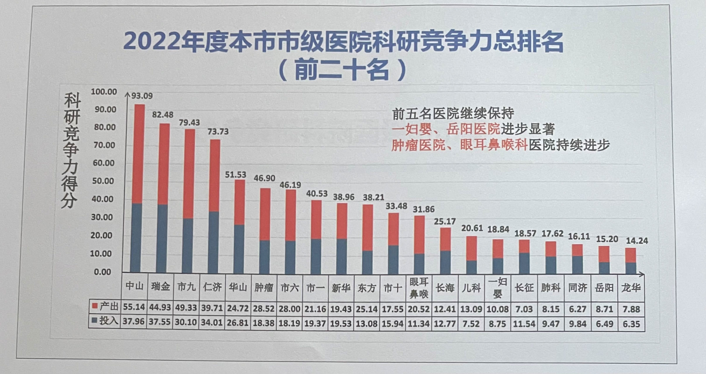 按惯例,“市级医院科研竞争力”评价本市38家市级医院,今年首次公布前二十名医院。值得注意的是,在前五名医院继续保持领先的情况下,一妇婴、岳阳医院进步显著,分别位列第15、第19名,复旦大学附属肿瘤医院、复旦大学附属眼耳鼻喉科医院持续进步,分别位列第6、第12名。