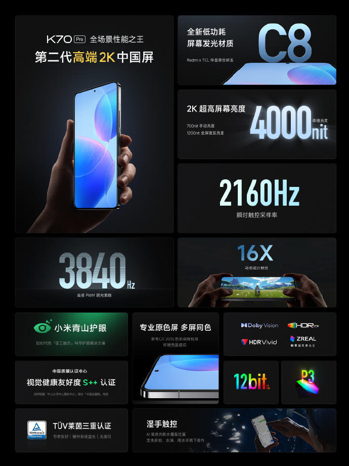 屏幕方面,Redmi K70 Pro 搭载“第二代高端 2K 中国屏”,峰值亮度 4000 尼特、2160Hz 瞬时触控、湿手触控。
