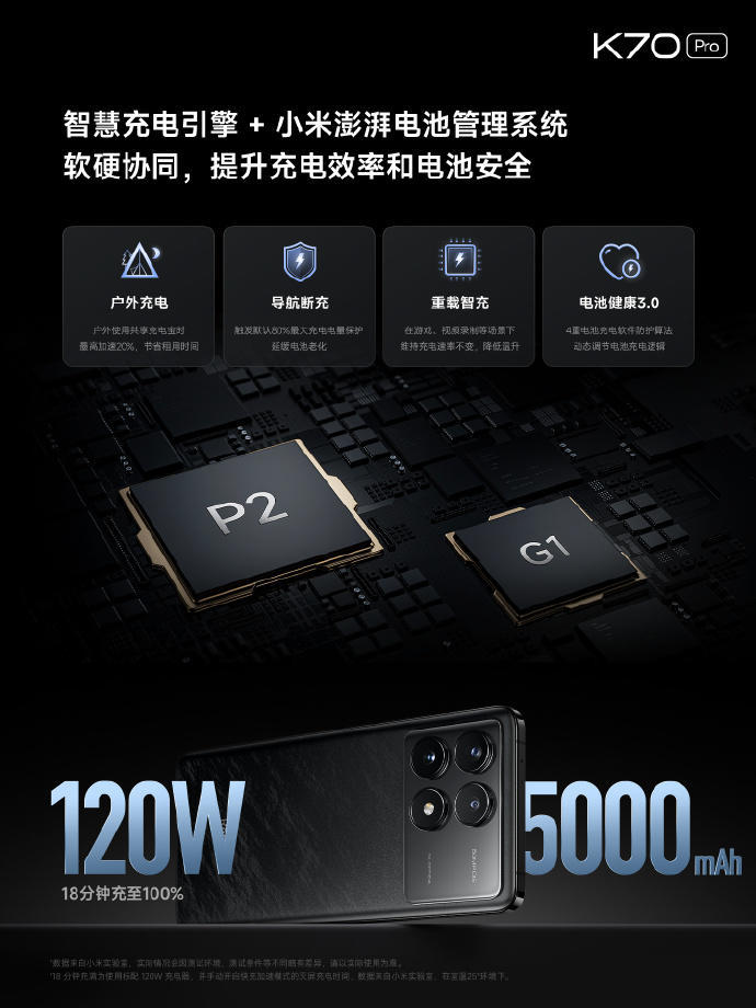 其他方面,Redmi K70 Pro 支持 5000mAh 电池 + 120W 快充,自研快充芯片澎湃 P2 + 自研电源管理芯片澎湃 G1;蜂窝网络、Wi-Fi 信号提升,还有 NFC、蓝牙音频分享等。