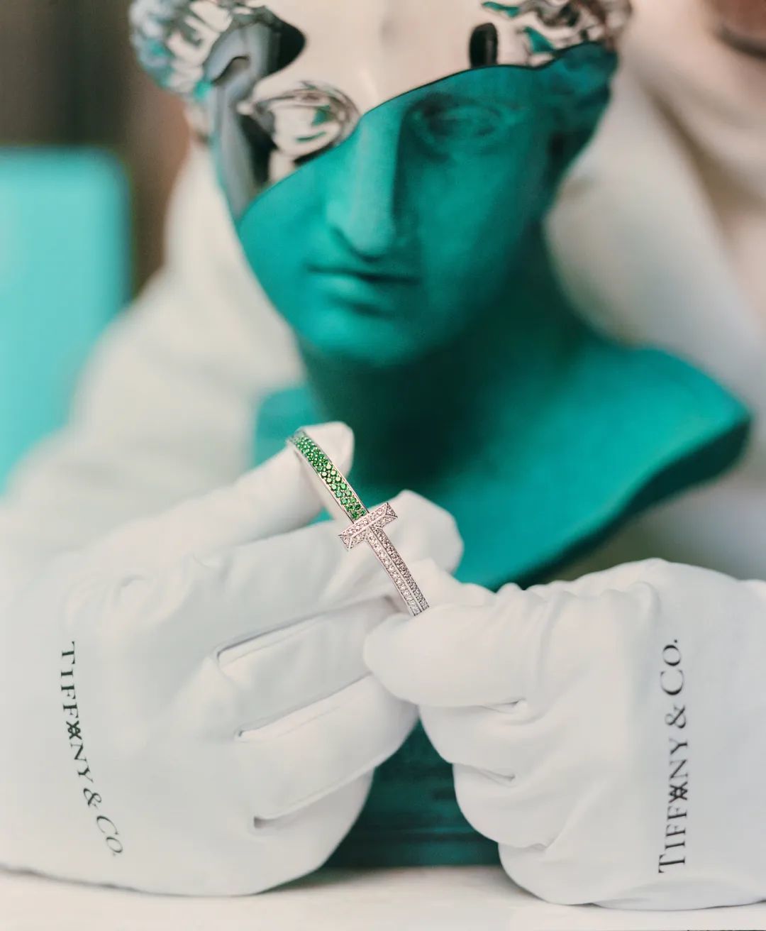 作为个人力量的象征,Tiffany T1 系列代表的不仅是勇气与毅力,更是每个人内心深处的坚定信念。这款联名限量版 Tiffany T1 系列18K白金手镯手工镶嵌 105 颗总重逾 1 克拉的钻石,以及 74 颗总重逾 2 克拉的沙弗莱石。沙弗莱石独特的翠绿色泽不仅契合半身雕像作品的铜绿元素,更与 Arsham Studio 的主色调相呼应。1974 年,蒂芙尼将沙弗莱石引入珠宝世界,这份对珍罕宝石的探索精神,与 Daniel Arsham 的未来 “考古” 美学理念有着异曲同工之妙。