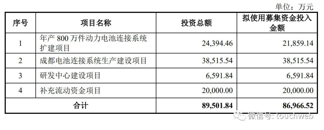 西典新能计划募资8.7亿元,其中,2.19亿元用于年产800万件动力电池连接系统扩建项目,3.85亿元用于成都电池连接系统生产建设项目,6591.8万元用于研发中心建设项目,2亿元用于补充流动资金项目。