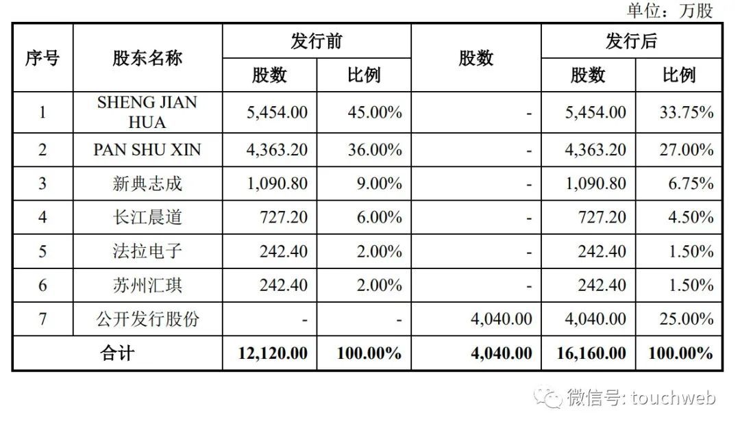 IPO后,SHENG JIAN HUA持股33.75%,PAN SHU XIN持股27%,新典志成持股6.75%;