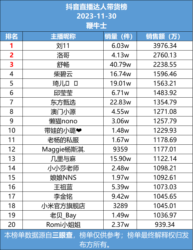 以下为11月30日各平台达人带货情况排名: