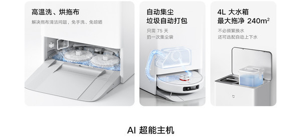 此外,最高60℃热水清洗拖布,更易溶解酱汁等顽固污渍。最快2小时热风烘干,无需手洗、免晾晒;辅以双风道自动集尘技术,17000Pa强劲气流,一吹一吸疾速收集垃圾至集尘袋内,最长75天扔一次尘袋;标配4L超大容量清水箱、污水箱,就算是240m2大户型也能一次清洁。并支持选配自动上下水装置,就像洗衣机一样自动进清水、排污水、自动加清洁剂,彻底解放双手。