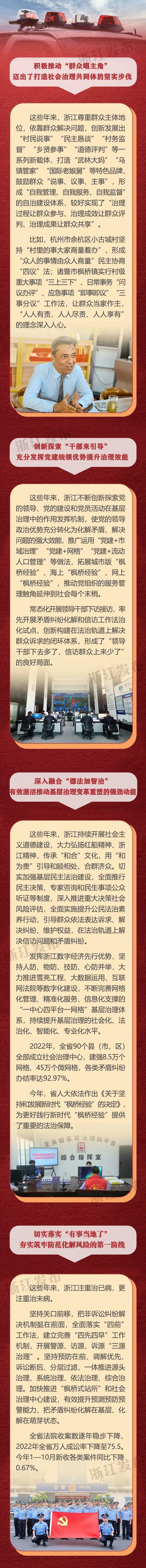 下一步,浙江将更好地统筹发展和安全,持续擦亮新时代“枫桥经验”金名片,走出一条理念更新、效能更好、活力更足、机制更全、领域更宽的省域社会治理现代化之路。