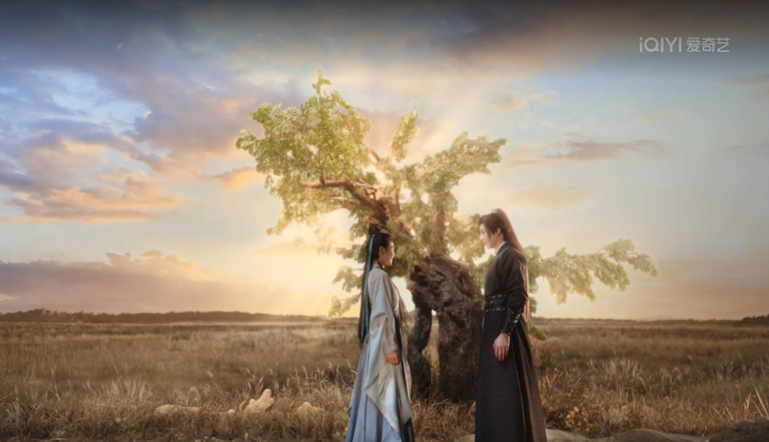 《一念关山》的主线大概像冒险闯关,大家赶路,然后遇险,破局。在第一个团战关卡结束后,很多同伴受伤,男女主夜晚去郊外寻珍贵药引不慎受伤,疗伤后,背靠背睡着了。醒来时天亮了,芳草萋萋,景色很美。