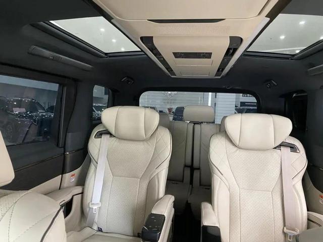 中间两张Ottoman座椅是重点区域,扶手上有液晶控制面板,提供电动调节、腿托、通风加热、按摩等功能,而且还有折叠小桌板。第三排座椅保持了向两边翻折收纳的功能,两侧布置了杯架和储物格。