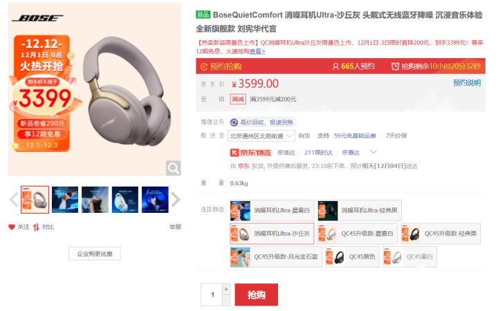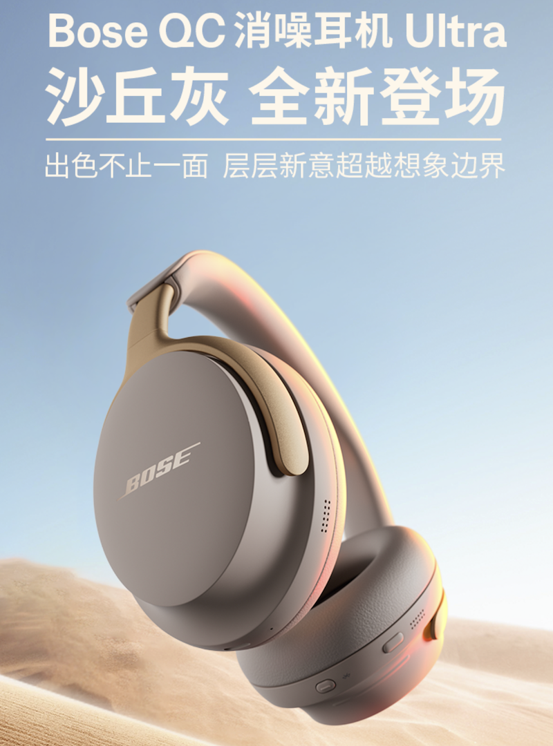 日前,Bose上架了QuietComfort Ultra头戴式降噪耳机的沙丘灰配色,售价3599元。
