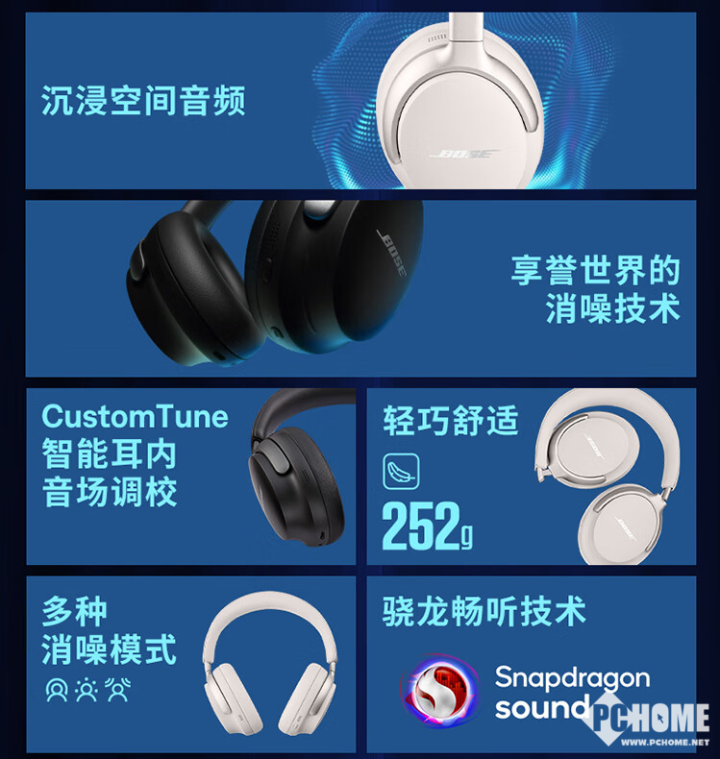 核心技术方面,Bose QC Ultra内置了Bose沉浸空间音频技术,可以提供宽广、深邃的声场,实现音频内容的多维和多层次呈现。通过板载IMU和新开发的Bose专有数字信号处理软件,带来了空前的真实听感。同时,QC Ultra还支持Snapdragon Sound骁龙畅听技术和最新的Qualcomm aptX Adaptive自适应编解码技术,实现无损和低延迟功能。通过Bose音乐应用程序,则可以进行快捷方式设置、聆听模式设置和EQ调节等。