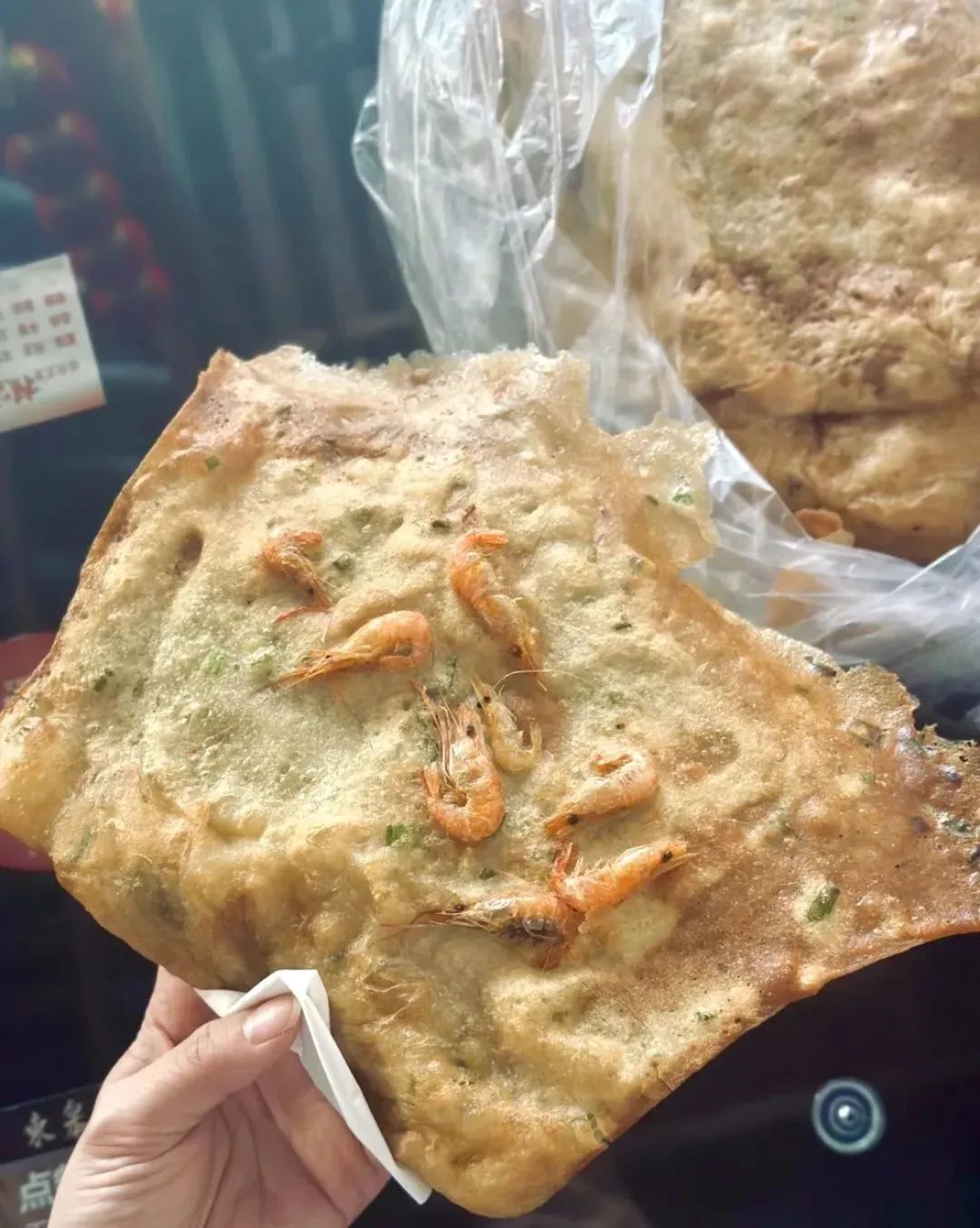 阿球最喜欢虾糍边边馓子般的酥脆口感,一不小心还会硌到上牙膛,吃到底下的口感又变得蓬松,咯吱咯吱舍舍不得停嘴,口感丰富又美味。