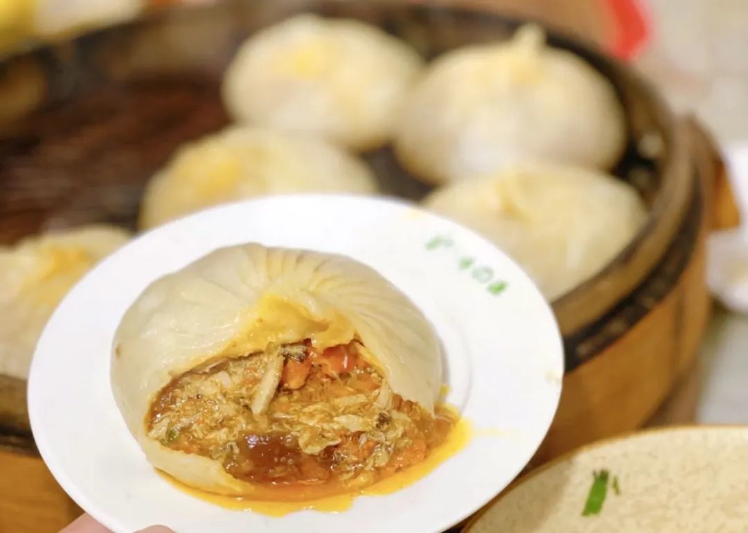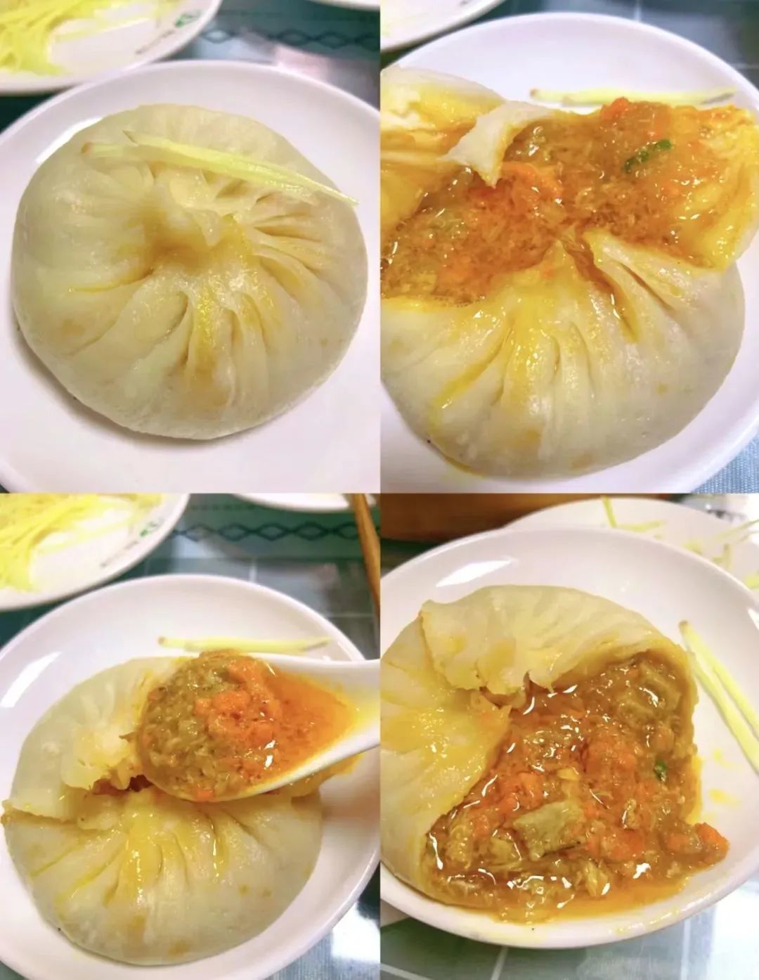 一个蟹黄包,就和隔壁靖江的汤包完全不同,如皋的蟹黄包,是整个蟹肉包进去的,量大又沉,说是蟹黄熔岩瀑布也不为过。