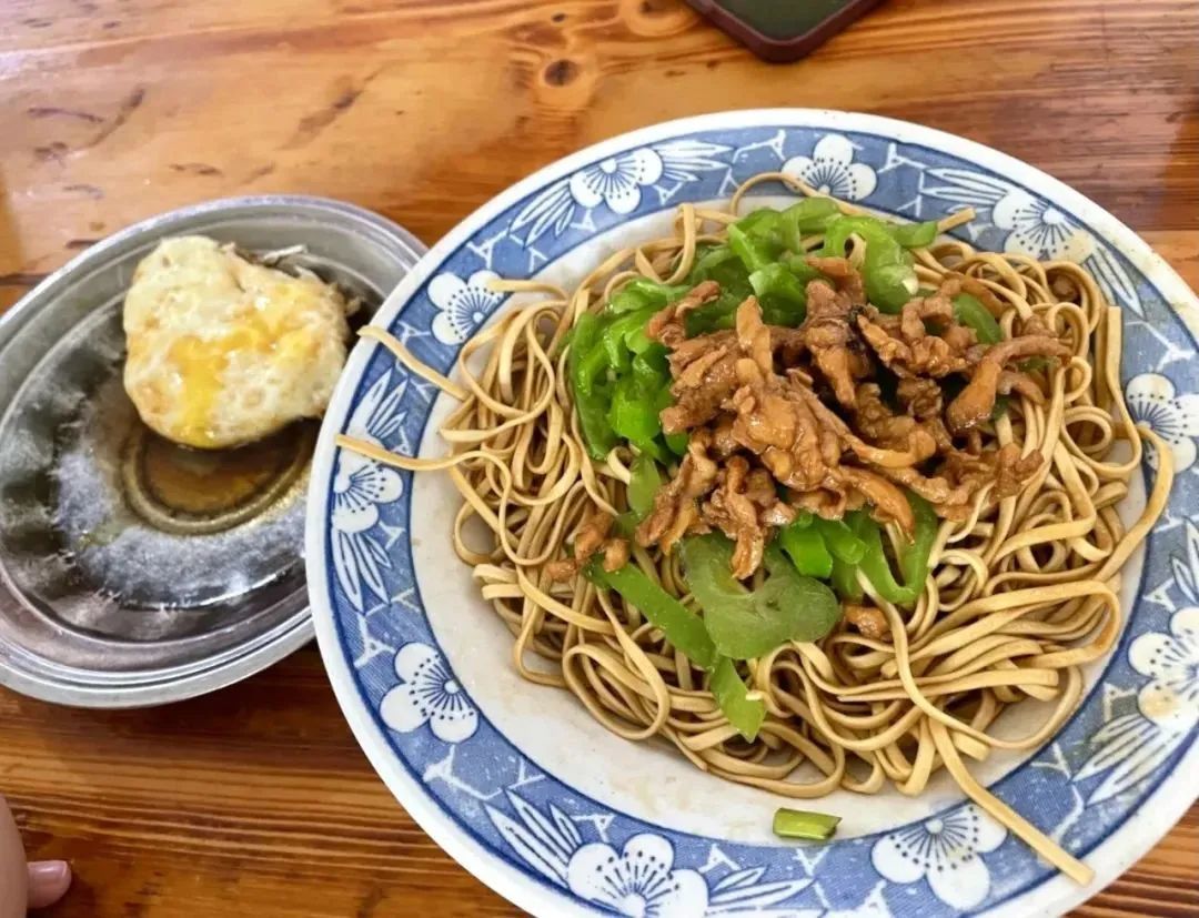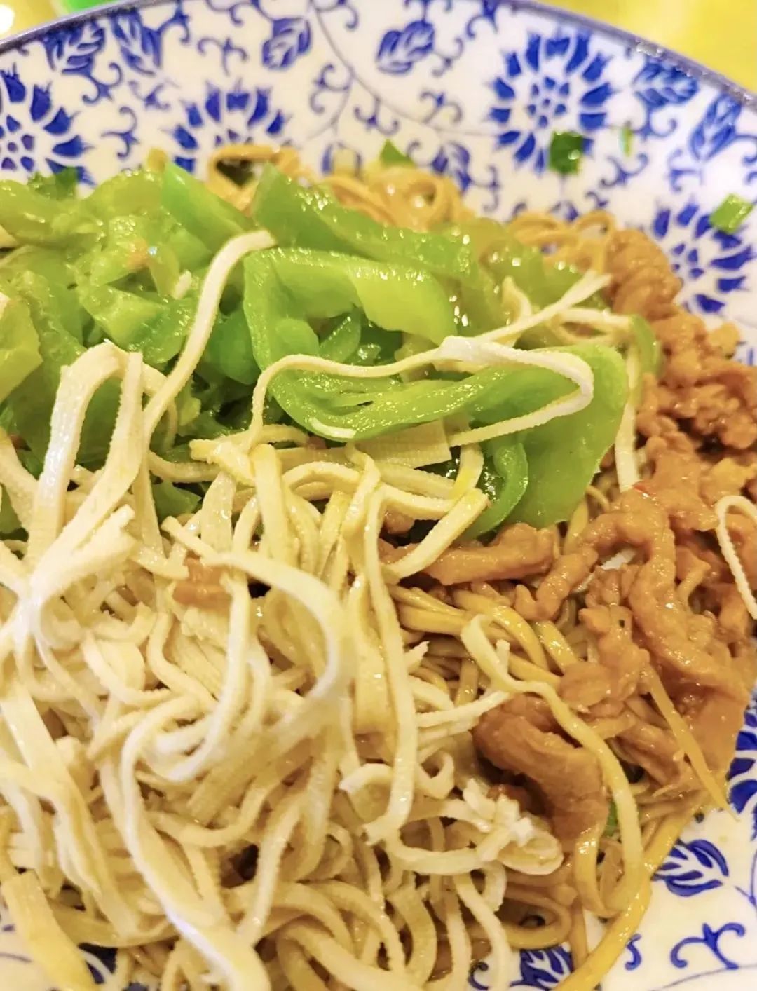 青椒肉丝面是店内招牌第一:生脆多汁的青椒搭配盘水碱面,浓郁又入味,面条口感软硬适中,加醋加辣椒加荷包蛋更是王炸组合,拌面里飘来的猪油是点睛之笔,香的很。