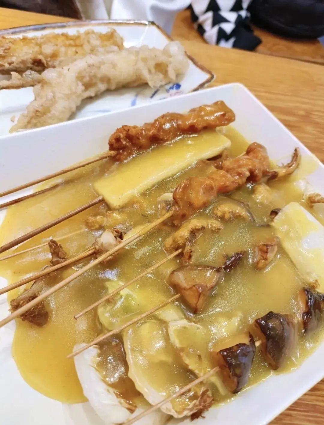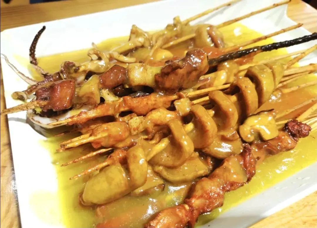 闸桥肉串绝对是如皋炸串届的顶流选手了,他家的炸串精华之处就在于酱料是“咖喱味道”的,是别有特色的一种酱料,桌上还会配有辣椒粉和孜然粉根据自己的口味添加。