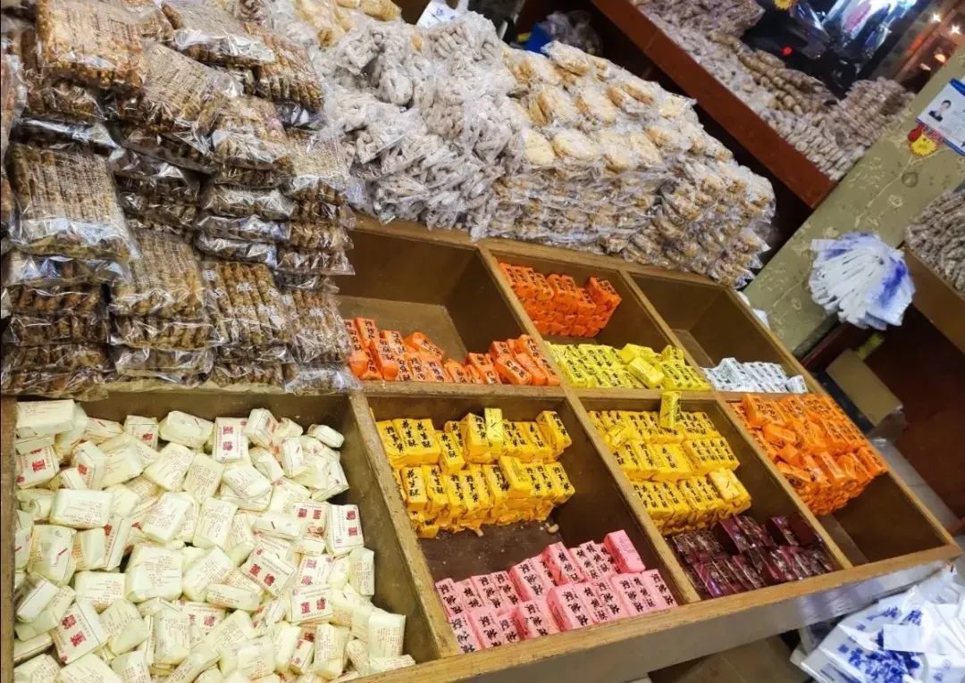 非物质文化遗产“董糖”,黑白芝麻口味的长脆散饼,快要失传的手艺薄荷糖,还有一些桃酥,脆饼,糖糕点,店内糕点眼花缭乱的,随便散装买点价格都很便宜,当作伴手礼送人也十分不错。