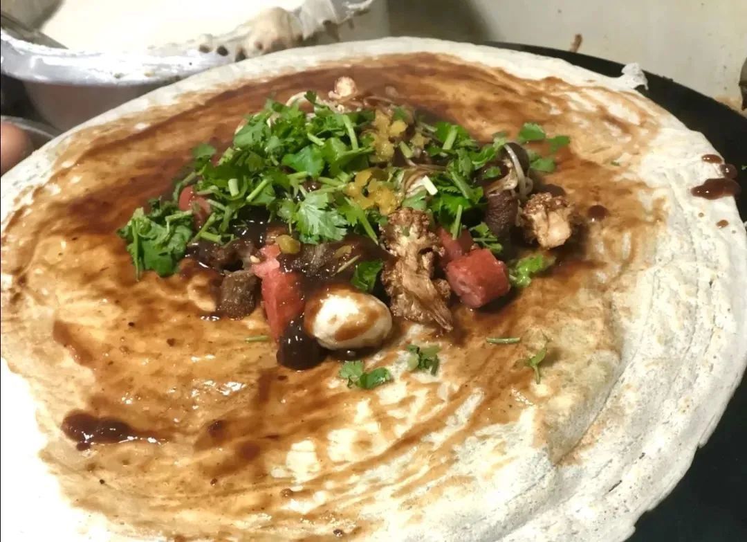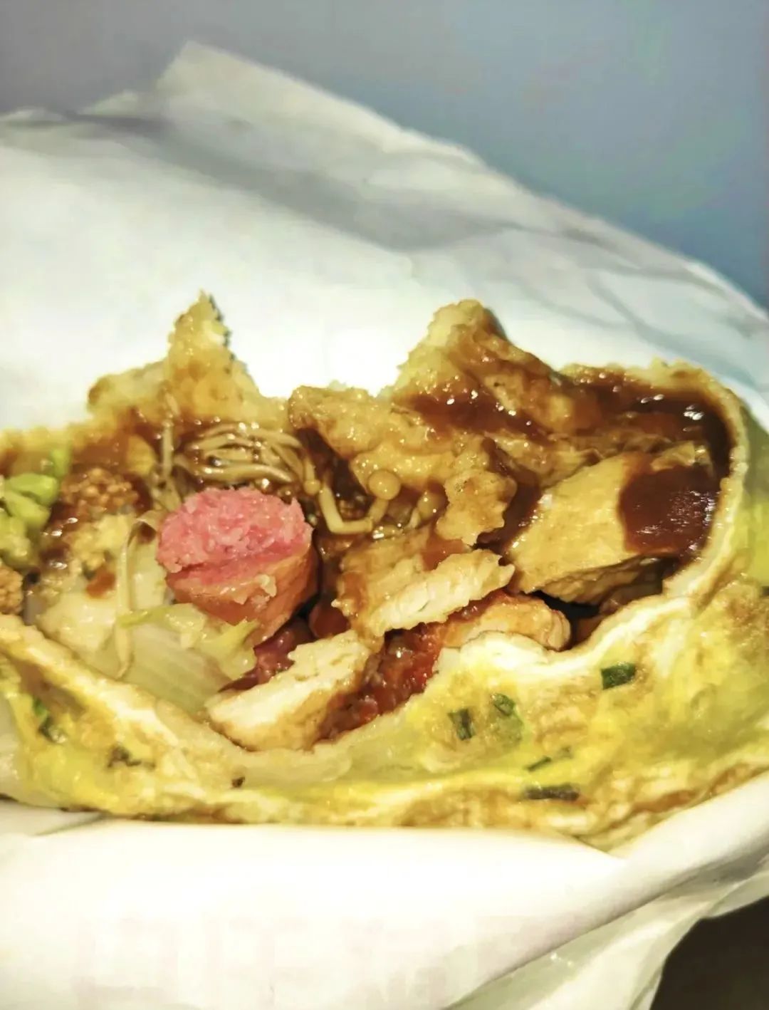 而这时饼皮也开始制作了,一勺面糊加鸡蛋摊了起来,刷上酱料后再把炸串铺平折叠完活,拿到手上仿佛一个“炸药包”,吃起来饱腹感十足,完全是横扫饥饿的蛋饼。