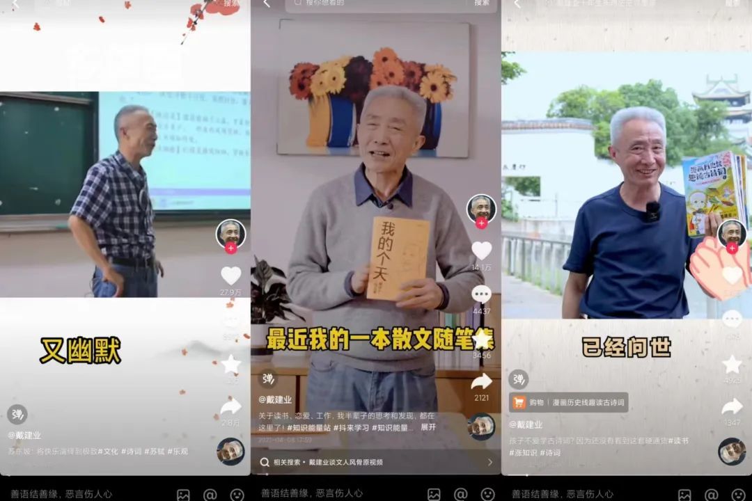 2018年9月,华东师范大学的古文教授戴建业入驻抖音,随后入住B站、快手等平台。因生动幽默的讲课风格,通俗易懂的语言,他在视频平台上受到大量喜爱。