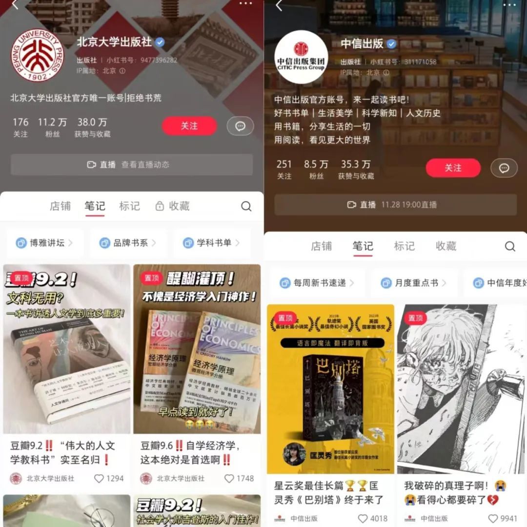 此外,随着出版社、书店的新媒体进程加快,其也在积极布局短视频赛道。据观察,在小红书、抖音、B站等平台,北京大学出版社、中信出版社、樊登读书会等官方账号和旗下达人账号都在保持更新,这也对读书博主、商业领域博主带来一些冲击。