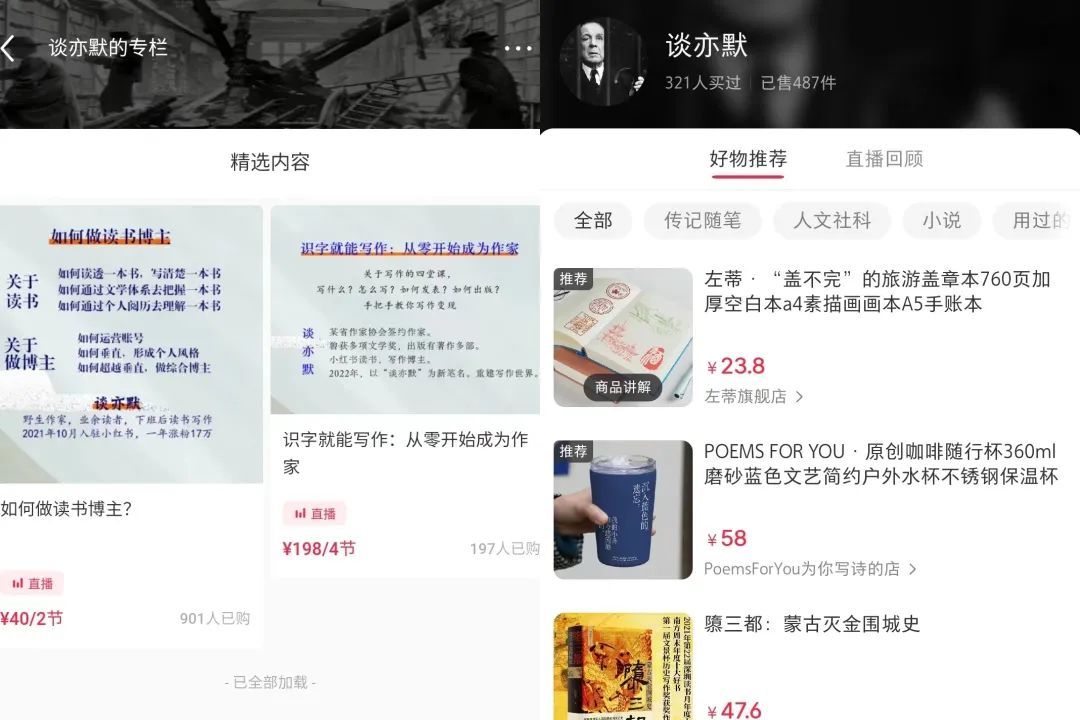 小红书粉丝26.4万粉丝的@谈亦默 ,则开通了知识付费专栏,上线的两套课程,分别售价40元、198元,前者卖出了901份。