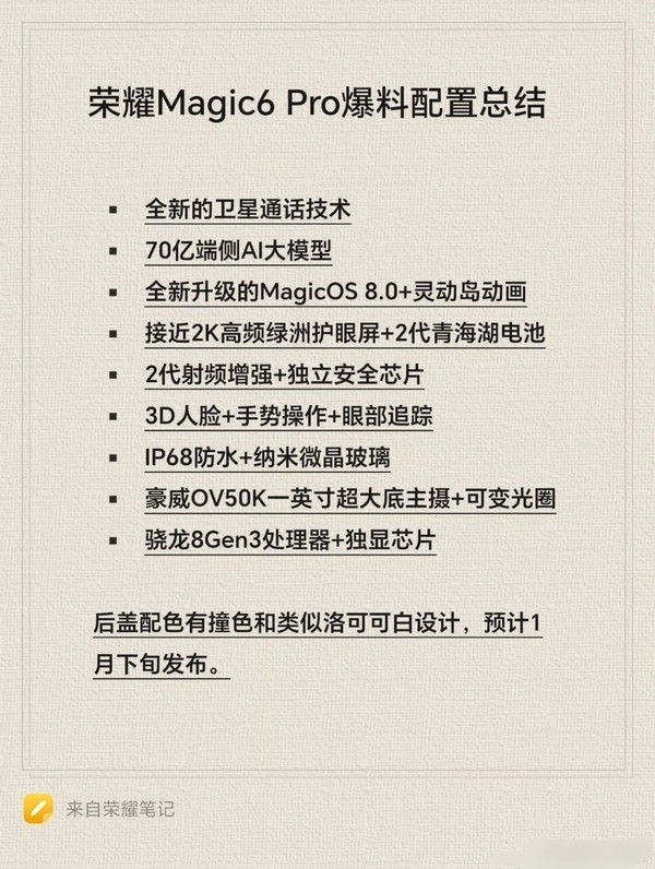 如图,这份爆料配置汇总既有官方透露的内容,也有产业链曝光的内容。具体来看,荣耀Magic6 Pro将搭载全新的卫星通话技术;融入70亿端侧AI大模型;系统方面将全新升级MagicOS 8.0,带来灵动岛动画(那么,屏幕会采用灵动岛设计吗?);搭载一块接近2K分辨率的高频绿洲护眼屏;内置第二代青海湖电池;内置独立安全芯片;支持3D人脸+手势操作+眼部追踪等功能;机身不仅支持IP68防尘防水,还覆盖纳米微晶玻璃;影像方面配备豪威OV50K一英寸超大底主摄,支持可变光圈;性能方面配备高通骁龙8 Gen3移动平台,并辅以独显芯片;手机后盖配色有撞色和类似洛可可白的设计。此外,爆料内容还预计新机将于1月下旬发布。