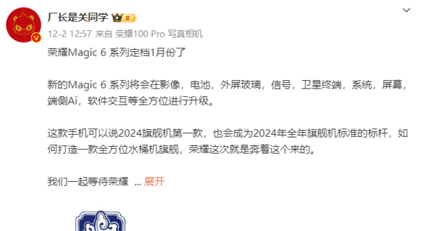 关于新机发布时间,有博主也爆料称,“荣耀Magic6系列定档1月份了”。其表示,新的Magic6系列将会在影像、电池、外屏玻璃、信号、卫星终端、系统、屏幕、端侧AI以及软件交互等维度全方位进行升级。“将成为2024年全年旗舰机标准的标杆,打造一款全方位水桶旗舰”。