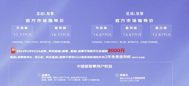 购车福利方面,凡在今年 12 月 31 日前购买星越 L 智擎的用户,可享受 NOA 智能领航辅助系统 2 年免费使用权,并针对吉利老用户推出 10000 元的置换补贴。而在 2024 年 2 月 9 日 24 点前,购买星瑞 L 两款车型的消费者,均可享受上市购车新年红包福利 3000 元。