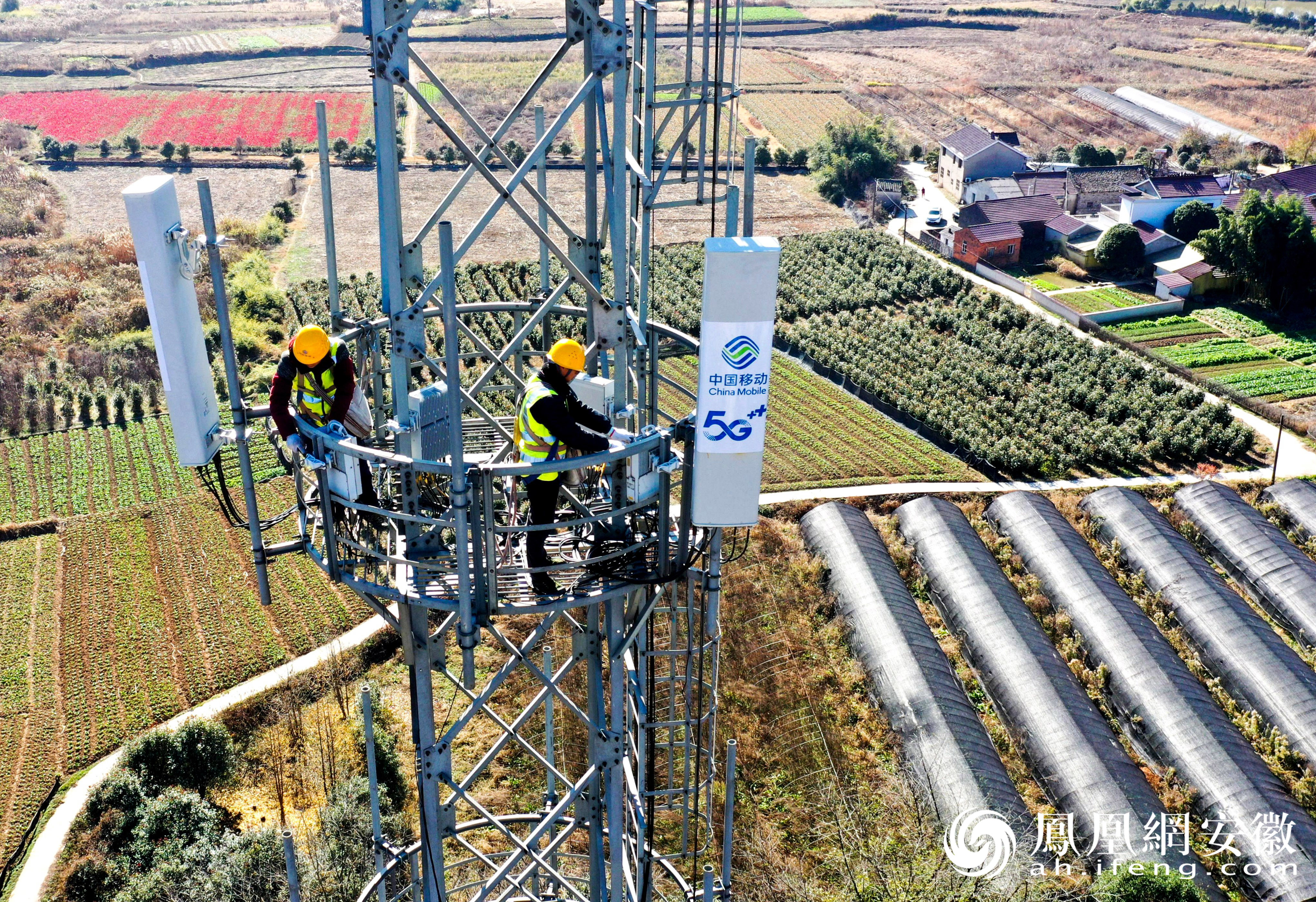 2023年12月1日,在安徽省铜陵市义安区钟鸣镇金榔村,安徽移动铜陵分公司技术人员在进行5G基站设备更新升级。(凤凰网安徽特约摄影师 过仕宁/摄)