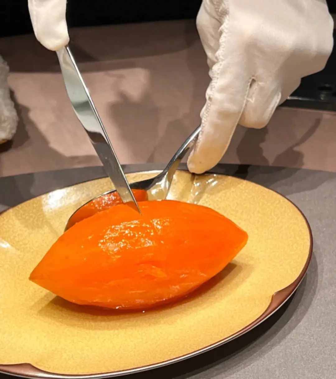 比如最近比较火的新荣记“穷鬼吃法”,其中必少不了这份38元一个的蜜汁红薯。江湖人称“红薯届的眉姐姐”,虽然外表平平无奇,但是搭配着新荣记“中餐天花板”的名头,就成了最有性价比的米其林甜品。