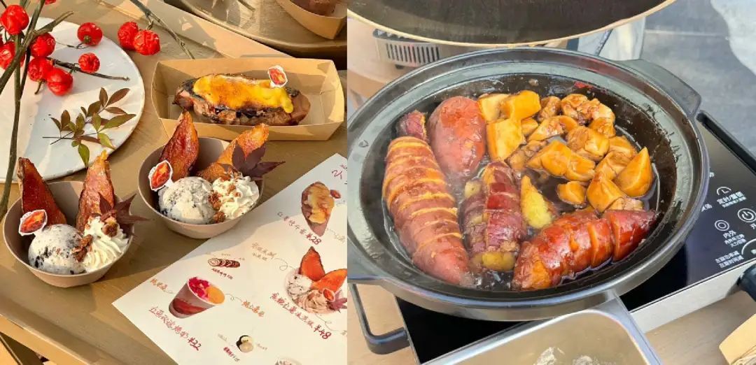 最近人均千元的米其林、黑珍珠双榜餐厅万朵山河也开始摆起摊来,主角正是烤地瓜。48元的焦糖红薯冰淇淋、28元的红薯烤布蕾,以及32元的红薯玫瑰烤奶,下周还将推出红糖红薯年糕,给红薯淋上茉莉花茶奶油和曲奇冰淇淋,摆上枫叶就成了创意单品。