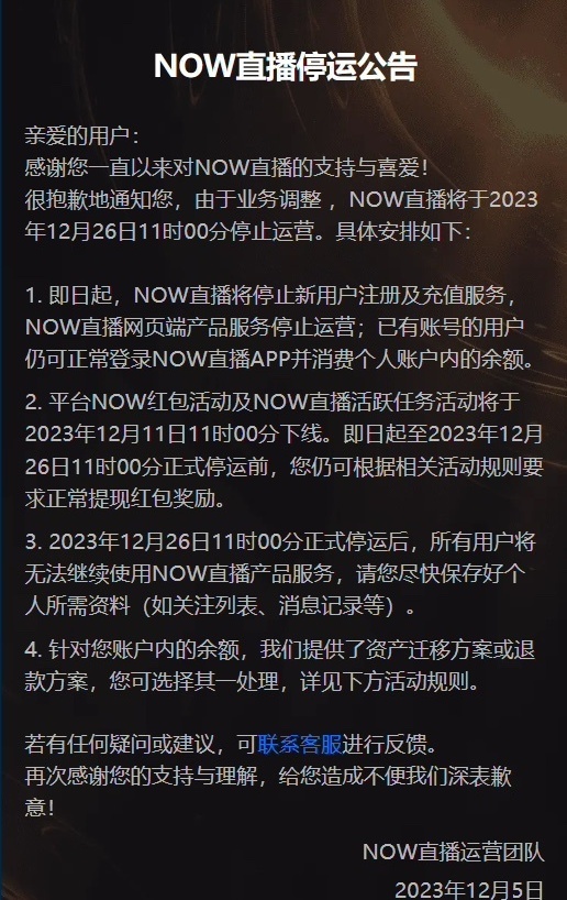 直到2023年10月,腾讯NOW直播App还进行过更新。官方5日公告称,即日起,NOW 直播将停止新用户注册及充值服务,NOW 直播网页端产品服务停止运营。