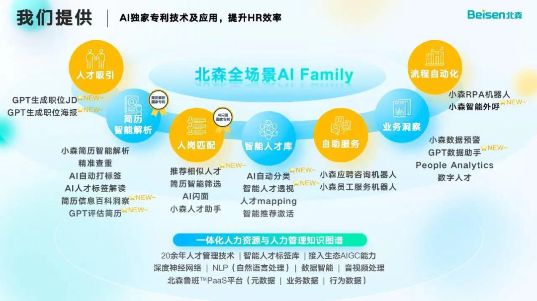 除此外,北森更是加强技术创新,将AI能力不断融入自身的产品中,形成“AI Family”产品家族,面向HR的应用场景,激活企业效能。技术的应用不仅加强了北森的产品竞争力,也为其打开了新的市场机会。