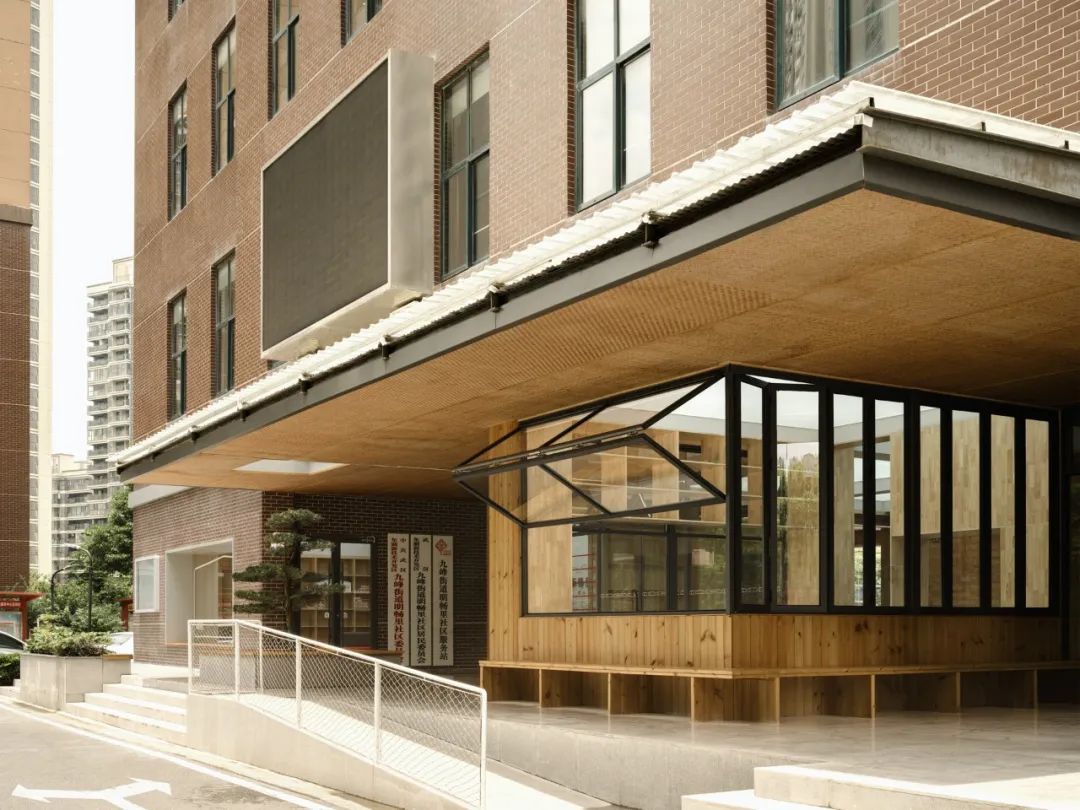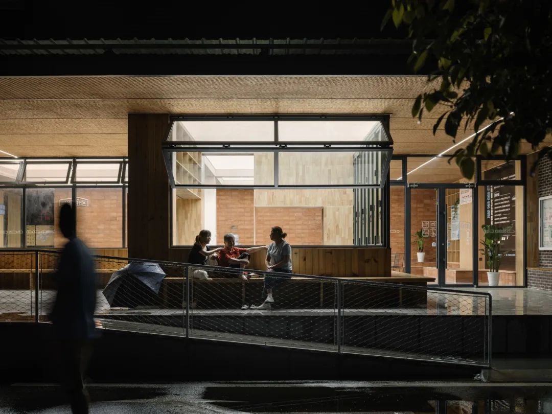 明畅里党群服务中心原来的立面设计没有办法真正做到让居民第一眼就能感知到这是一个“开放共享”的公共空间,而且外界没有可以拓展的场地。因此设计上牺牲一部分室内面积作为半开放空间,形成具有公共性的开放场所,让居民可以在门口坐下来,找到老九峰村民熟人社会的归属感。
