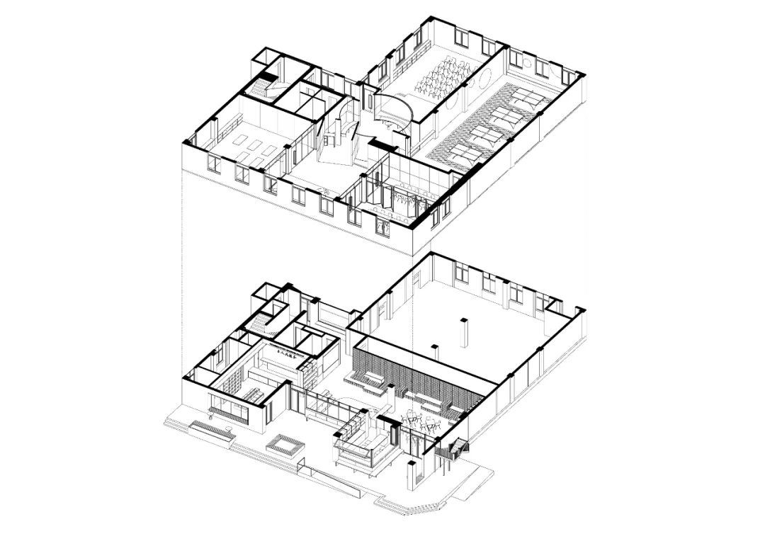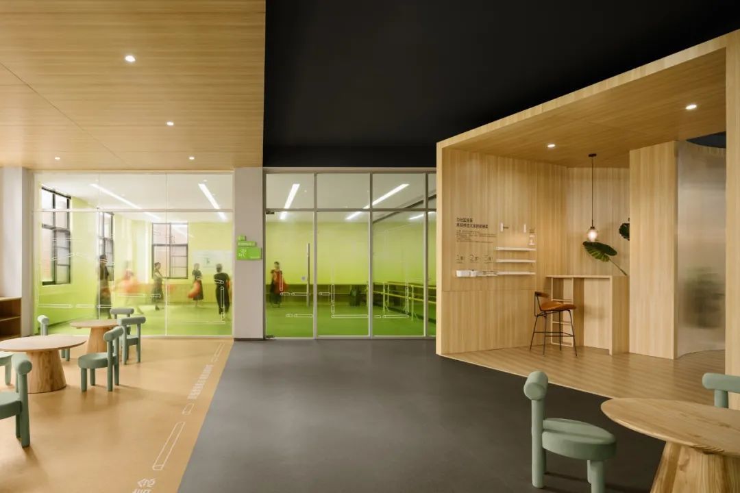 因此,本次改造将社群、社团的活动场所集中布置设计在了三楼,并通过一个非常规的圆形“走廊”,用来调整其和“房间”的关系。使其成为一个平等的空间,让走廊的功能在这里制造,容纳,发酵。这样不仅能减少对工作人员的影响,也能促进各个社团的交流,还为新的社团孵化预留了空间。几个小的社群空间也进行了功能复合的考量,可以依据使用需求和使用场景变换,既能开展社区课堂、社区市集,也能开小会或者开展工作坊,以此避免单一功能在空间使用上造成的资源浪费,减少闲置空间。