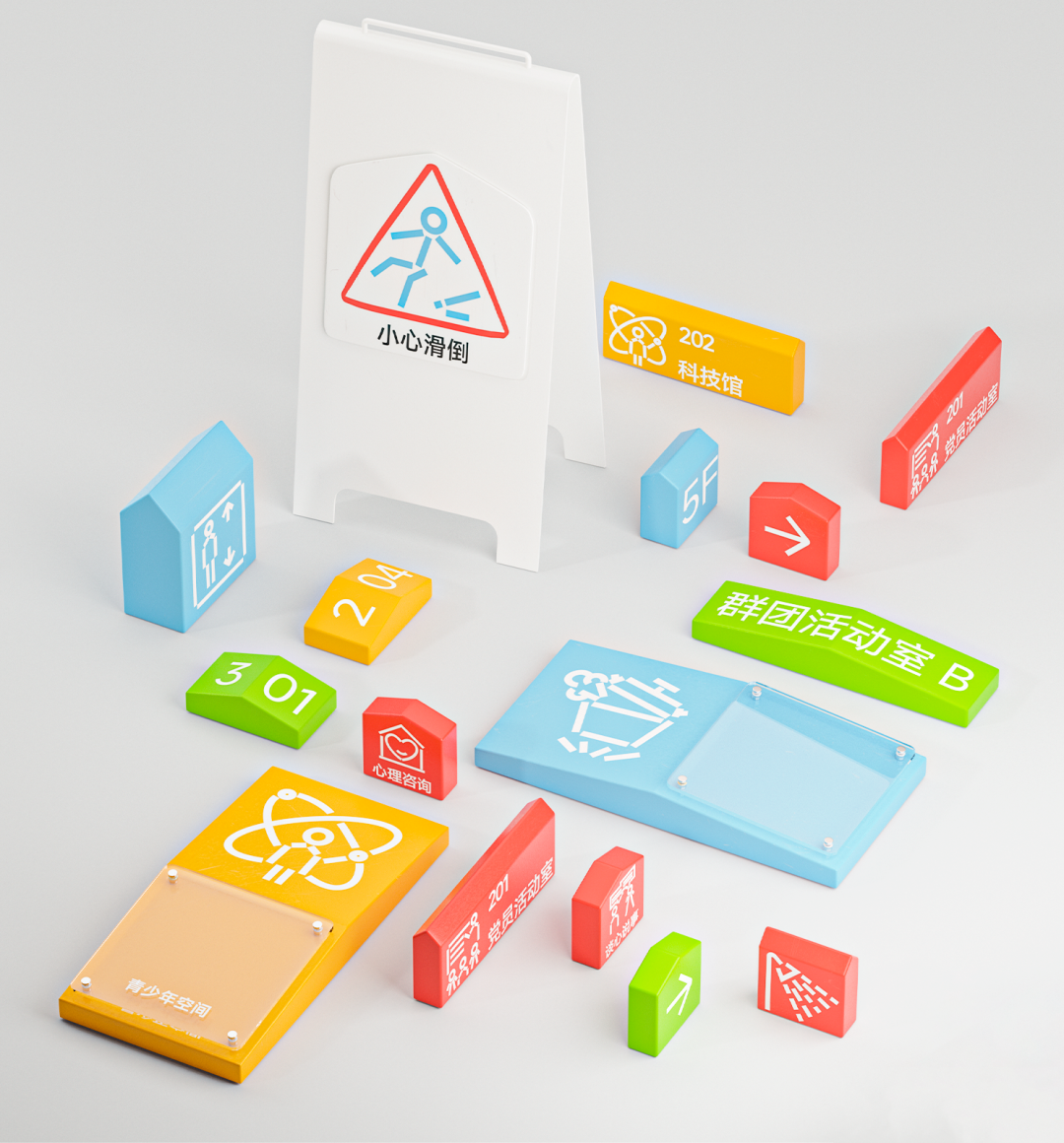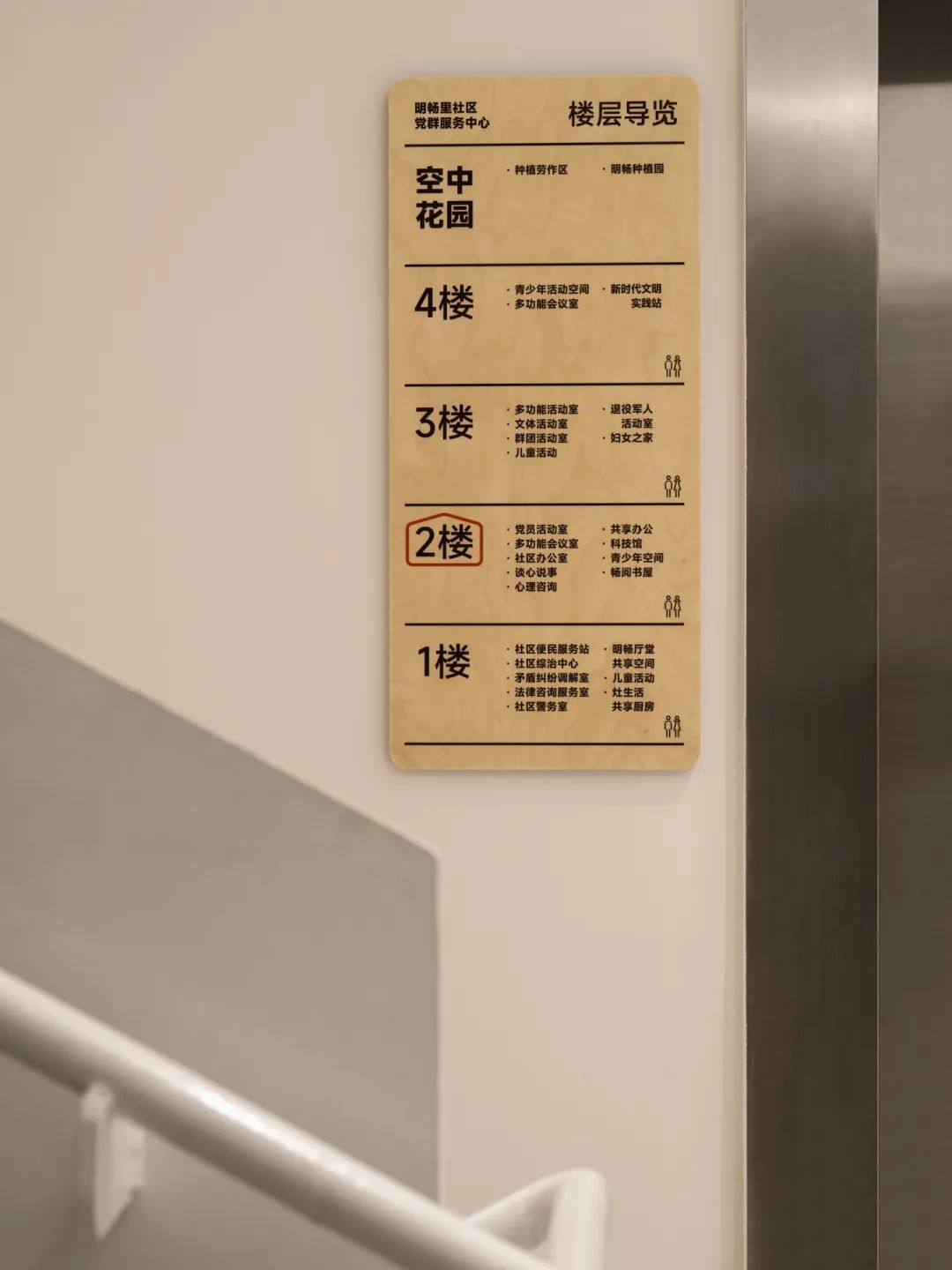 考虑到社区实际工作中问题的多样性以及空间使用中经常存在多种功能的叠加,导视设计选择固定属性+复合功能的组合形态,同时采用易于更换和简单的工艺,方便社区后期维护使用。