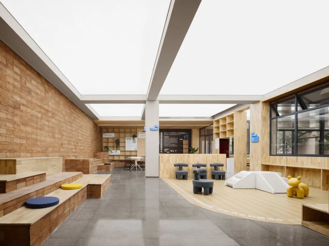 便民服务大厅在一楼,除了方便居民进出办事,为了满足居民办事和闲坐聊天的需求,不仅设立了专门的一岗通服务空间和休闲沙龙区,还设立了儿童活动区。不仅为社区儿童提供了活动空间,还方便了那些带娃办事的居民。改造经费虽有限,但基本都用在了社区公共空间和活动空间的改造上。二层秉承着“办公空间最小化、服务空间最大化”的原则为社区工作人员提供了舒适的办公环境,也为来访居民提供了说事儿的场所。