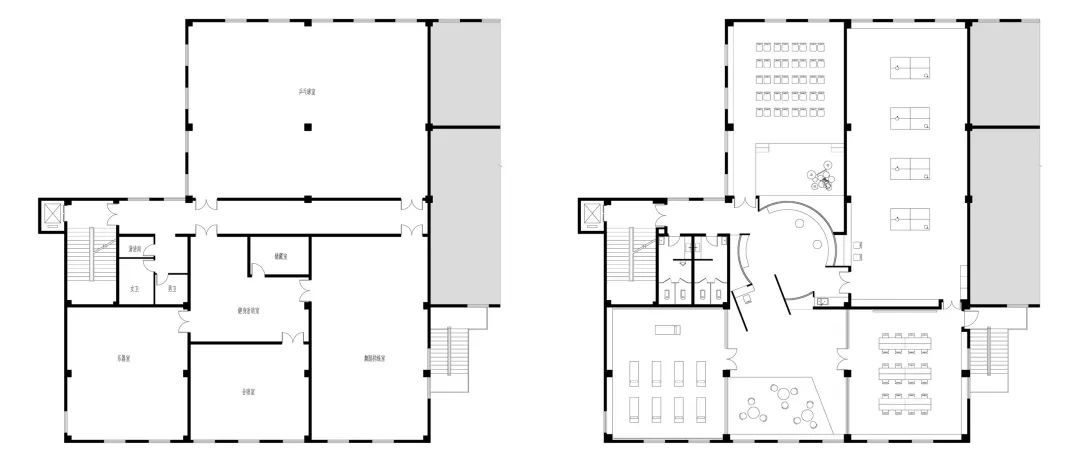 〇三层改造前后平面对比。左图改造前,右图改造后。