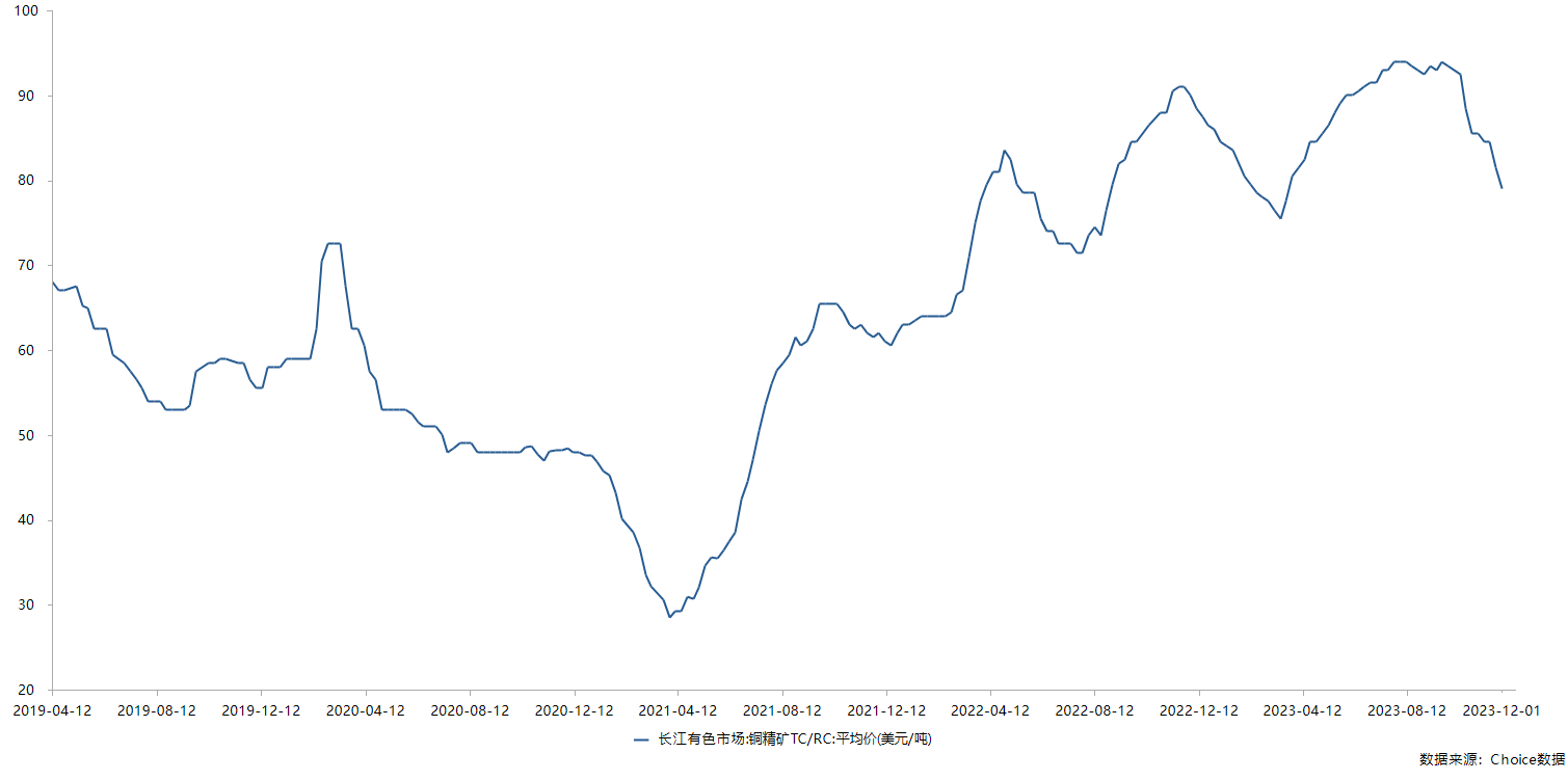 长江有色市场铜精矿TC/R平均价 美元/吨 (数据来源:Choice)