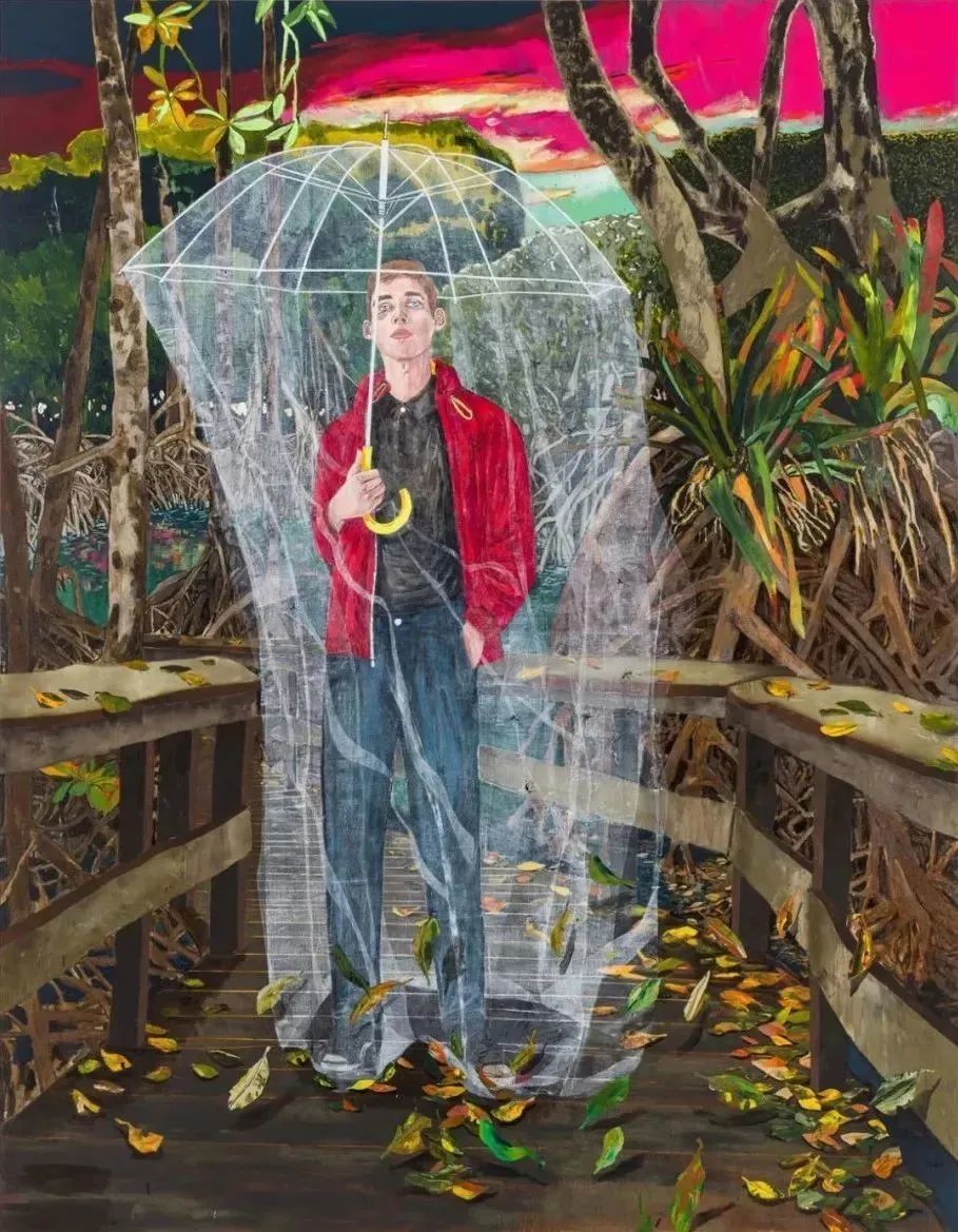 《黄昏沼泽生存指南》是赫尔南・巴斯在疫情隔离期间所作。标志性的男子伫立在画面中央,与众不同的是男子手中持着的透明雨伞,伞布延长垂至地面,将他全部笼罩在内, 这似乎成为可以逃离现实世界的盔甲。他眼神迷离地望向远方的天际,在艺术家打造的奇幻风景中沉思着,满地的落叶和瑰丽的黄昏暗示隐含在人物内心的不安和焦虑情绪,渲染了画面的忧郁和脆弱感。赫尔南・巴斯用华丽的色彩和精细的笔触塑造了怪诞奇幻的景观,使得观众沉浸在这样一个介于现实与超现实的奇幻世界的同时也或许会反思自己是否能打破束缚,找到现实生活的出口。