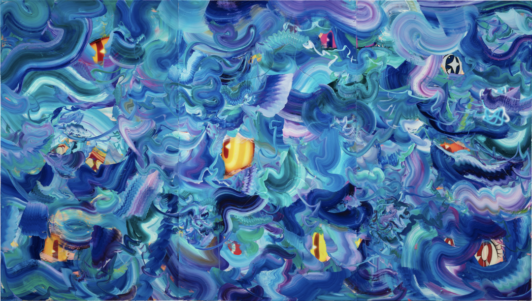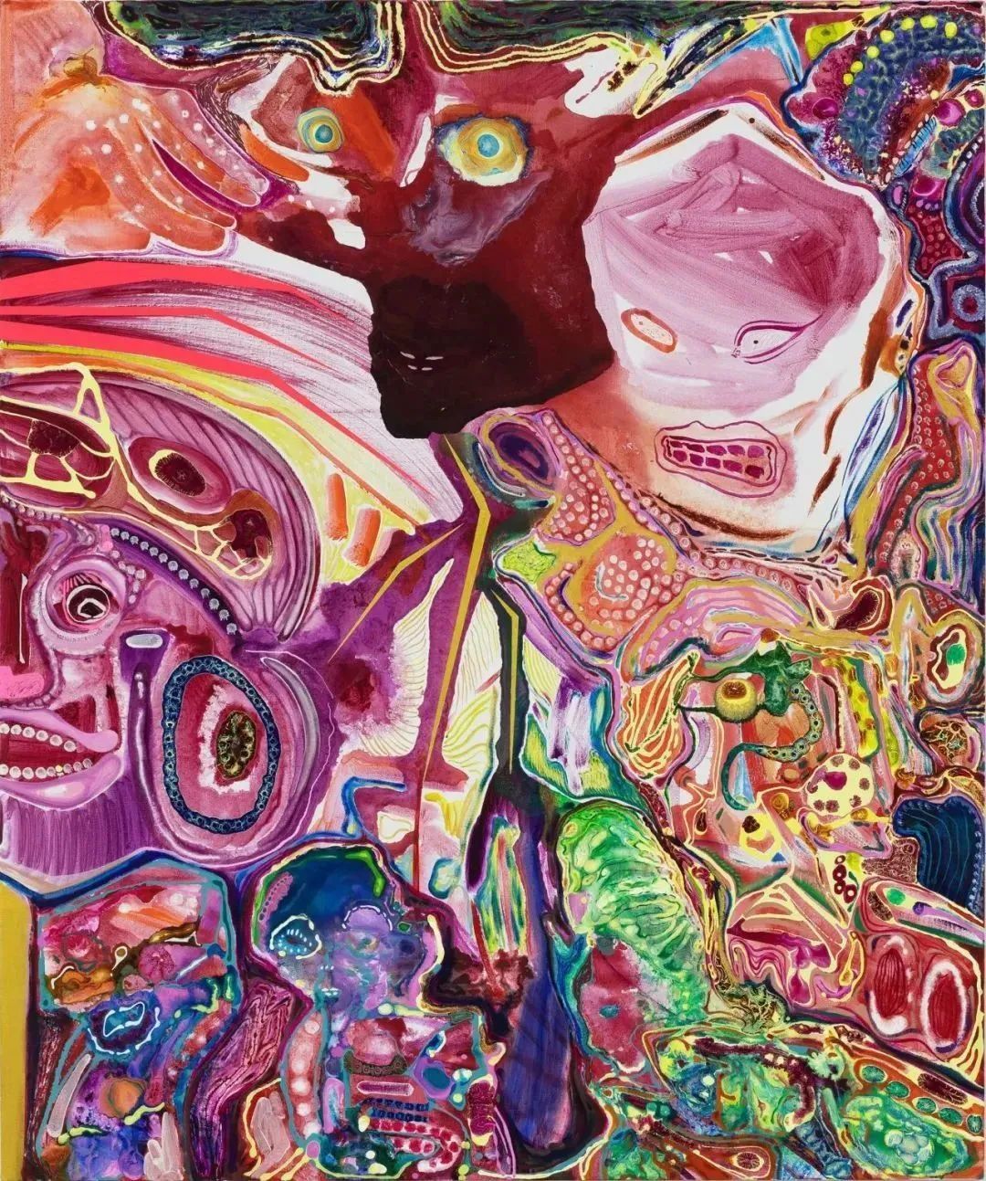 《LUCY》系列的绘画和影像作品灵感来自于著名的人类祖先 “Lucy”,他试图以此为主角创造出一个虚拟的数字化原始世界,让观者回忆起伊甸园的荒诞幻想。他汲取了马蒂斯晚期的美学思想,运用了丙烯、拼贴和喷漆等多种媒介进行创作,探索众生和植物的原始形态。