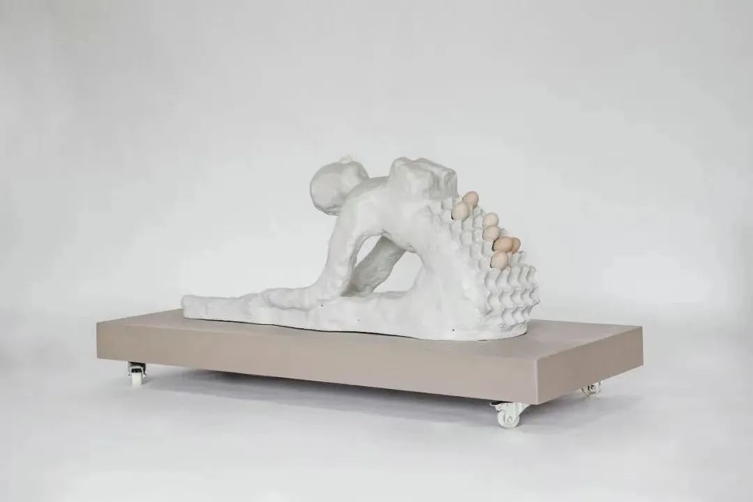 ▲段建宇,《遗落在人间的珍宝 No.2》,2014,素瓷,鸡蛋,玻璃钢底座,54.5 × 60 × 140 cm。图片由艺术家及维他命艺术空间惠允提供,藏家:张恺镕,之已基金会创始人、当下艺术基金会联合创始人
