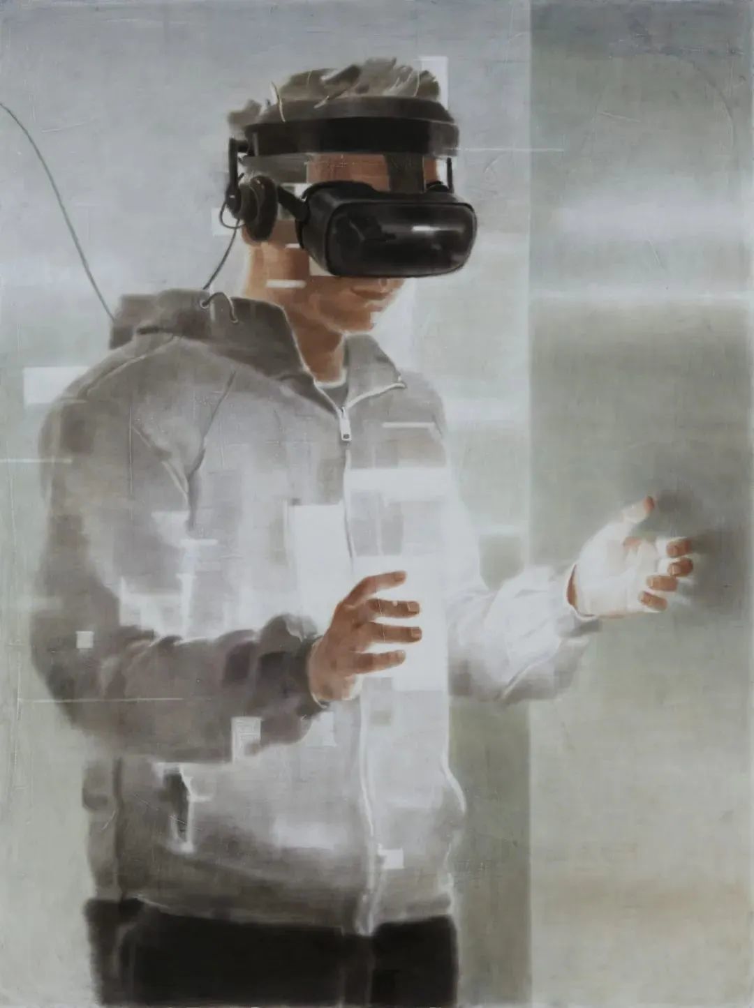 一个青年头戴VR设备,伸出双手,仿佛在感受另一种空间维度。作品《空间感》试图描绘今天的人和今天的光是什么样子。现在是科技快速发展的时代,VR技术开启了人在虚拟的真实空间中的感知,在这之前,人们是没有这样的体验的。画面中的人和现在的我们一样,刚刚开始这样的新感受。举起的手有仿佛有探索,触碰,丈量新的空间感之意。画面希望通过这样的安排,创造一个属于现当下的有意思的瞬间。
