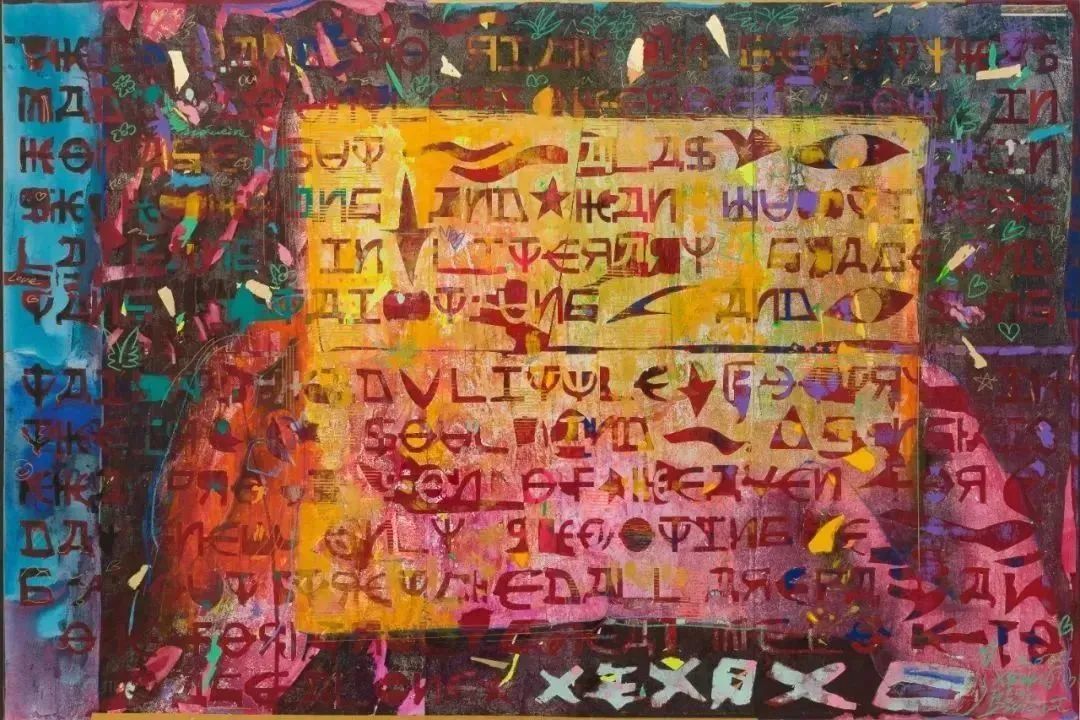 Oil, spray paint, acrylic, resin, digital print on canvas