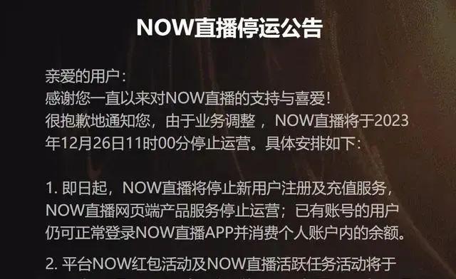 很抱歉地通知您,由于业务调整,NOW直播将于2023年12月26日11时00分停止运营。具体安排如下: