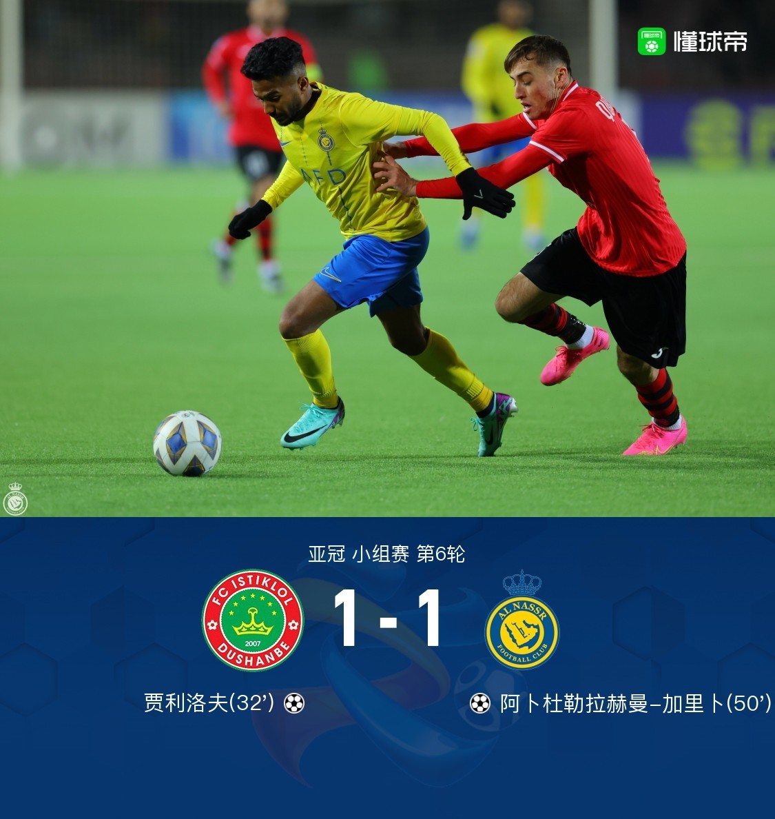 北京时间12月06日亚冠 小组赛 第6轮,杜尚别独立主场对阵利雅得胜利,C罗缺席本场比赛。上半场,加里卜回传失误,贾利洛夫贴地斩破门;下半场,加里卜连续两脚攻门将比分扳平。最终,利雅得胜利客场1-1战平杜尚别独立。