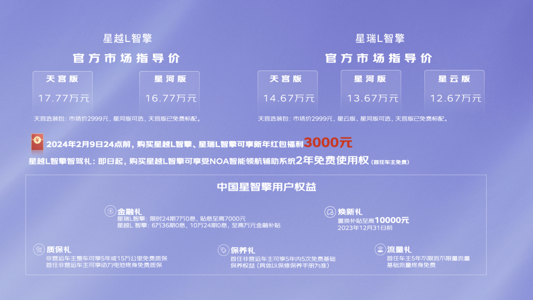 当然了,这两款车在其他方面的产品力也是强得很,基本上在配置上做到了目前15万级的顶尖水平。而更惊人的是定价,星瑞L智擎的起售价居然只要12.67万,星越L智擎起售16.77万。而且吉利老车主换购还有1万块减免,星越L还有2年的NOA功能免费。可以说不管是售价还是权益基本都给足了。